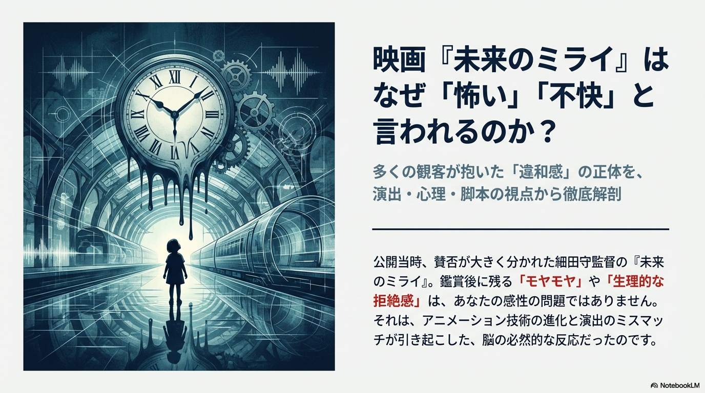 細田守監督の作品の中でも、未来のミライは「怖い」という声が多く聞かれる不思議な映画ですね。実際に視聴してみて、未来のミライが怖いと感じる理由は、単なるホラー的な怖さではなく、もっと心の奥底に触れるような不気味さにあるのかなと感じています。